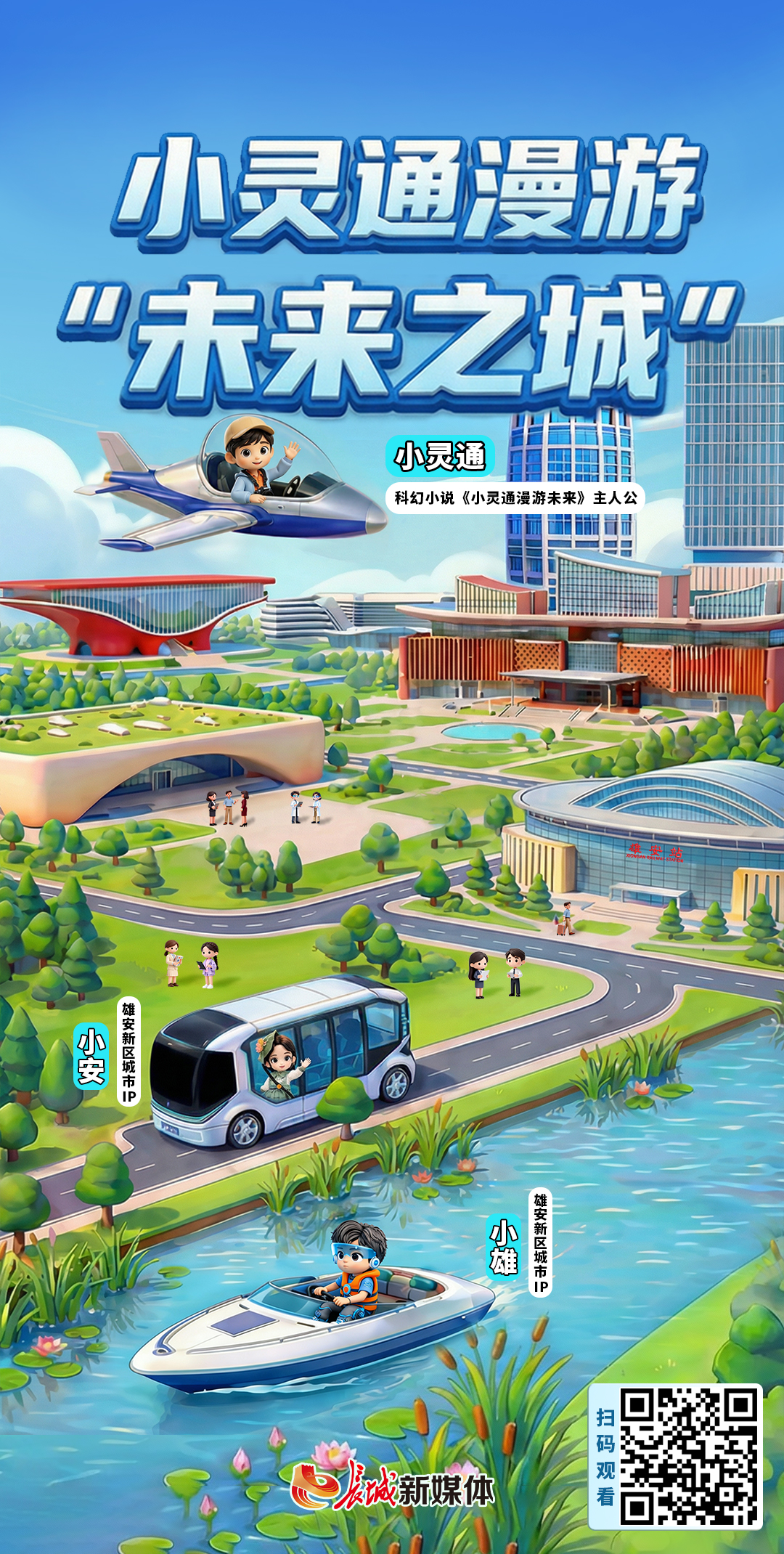 點(diǎn)擊上方圖片或掃描圖片上的二維碼,和小靈通一起“上天入地”漫游雄安新區(qū)。